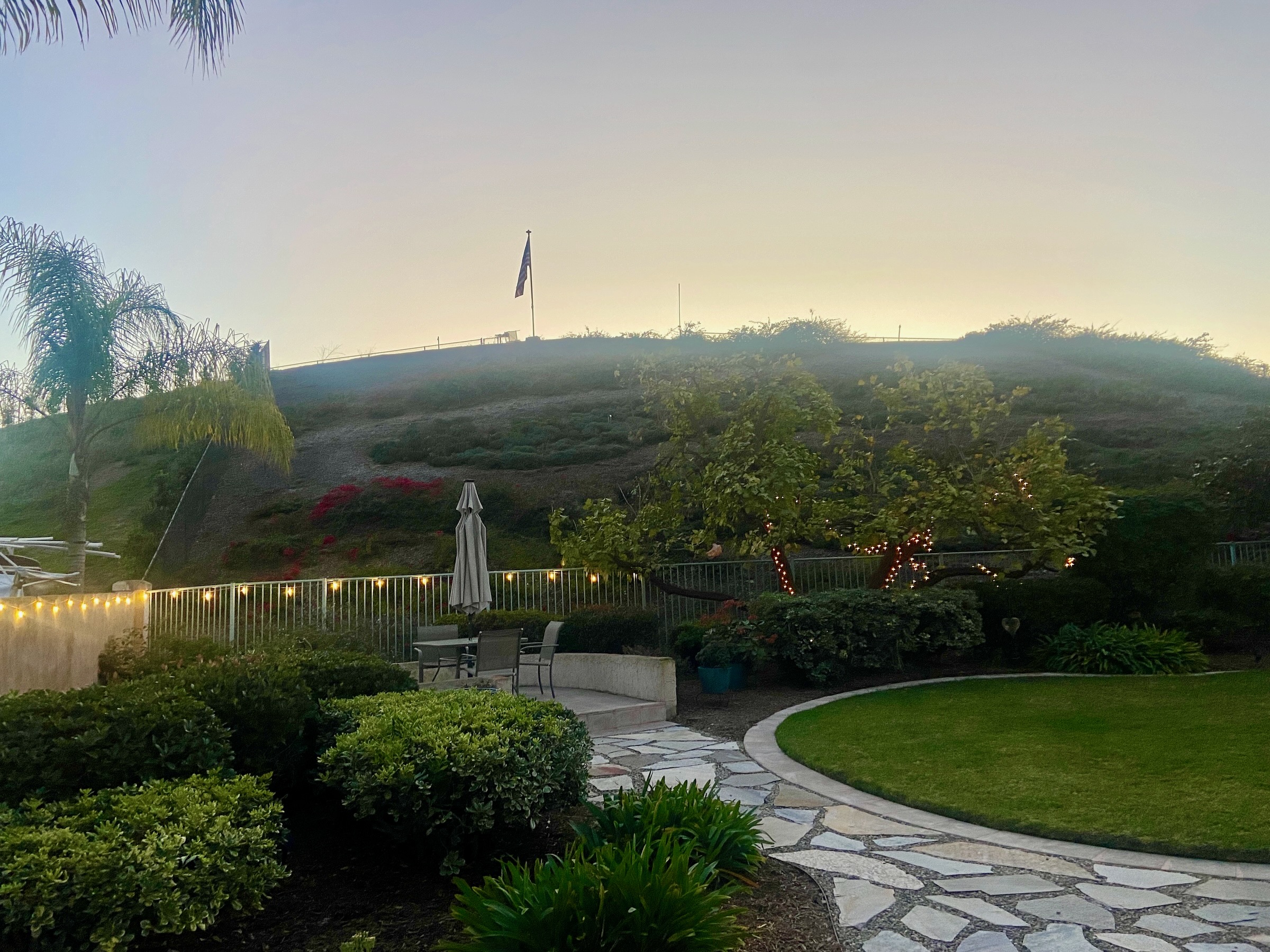 It is twilight, not really, as the sun has sunk behind our slope, but not down on the Pacific horizon, no, not down on the western horizon. If i wished to climb up to our flag, i could watch it set, possibly catch a “green flash.”