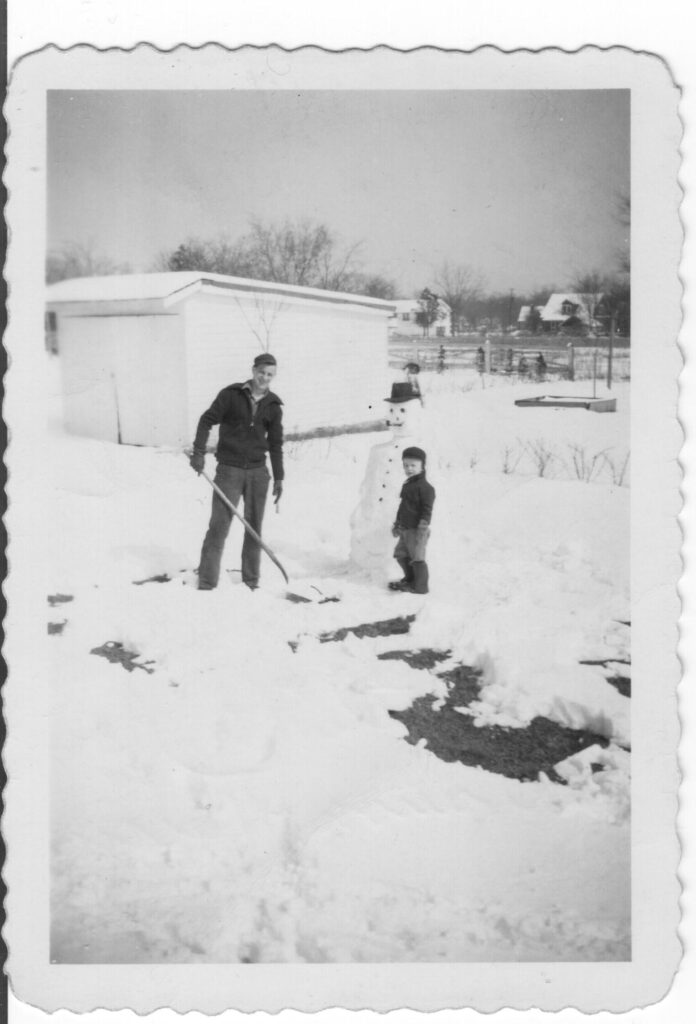 Long ago and far away in a little Tennessee town, now overgrown with progress and people, i’m guessing 1949: Daddy and i, mostly Daddy, making a snowman in our backyard. That’s our garage in the background.