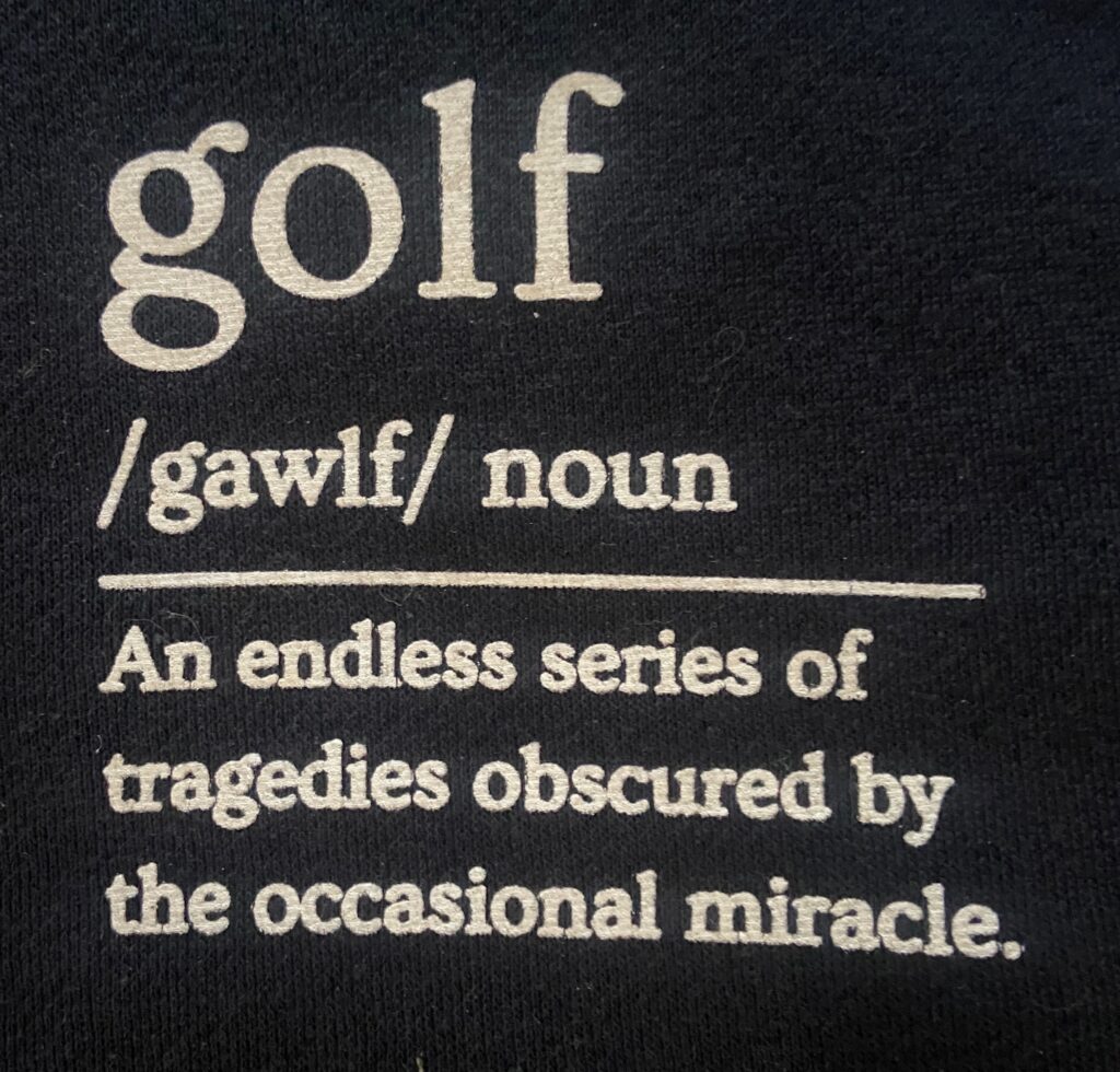 The sweatshirt graphics also perfectly describe my golf game. i would add the tragedies are nearly always accompanied by a yell from a sailor’s vocabulary, i.e. profanity. i have tried to stop, but hey, i’m on a golf course with a bunch of guys, and i am only commenting on my talent, or lack thereof.